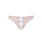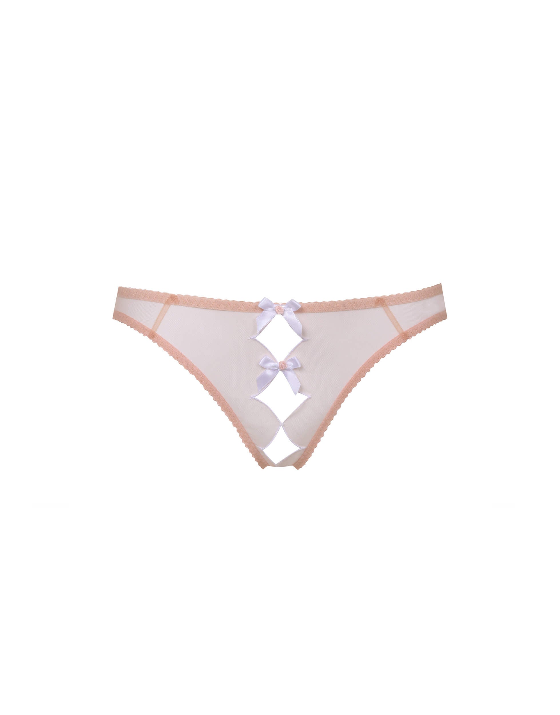 The Lorna Ouvert is a beautifully constructed open brief that holds all your secrets. With cut out details from front through the gusset, to the rear. Featuring satin bows and opaque pink trims.