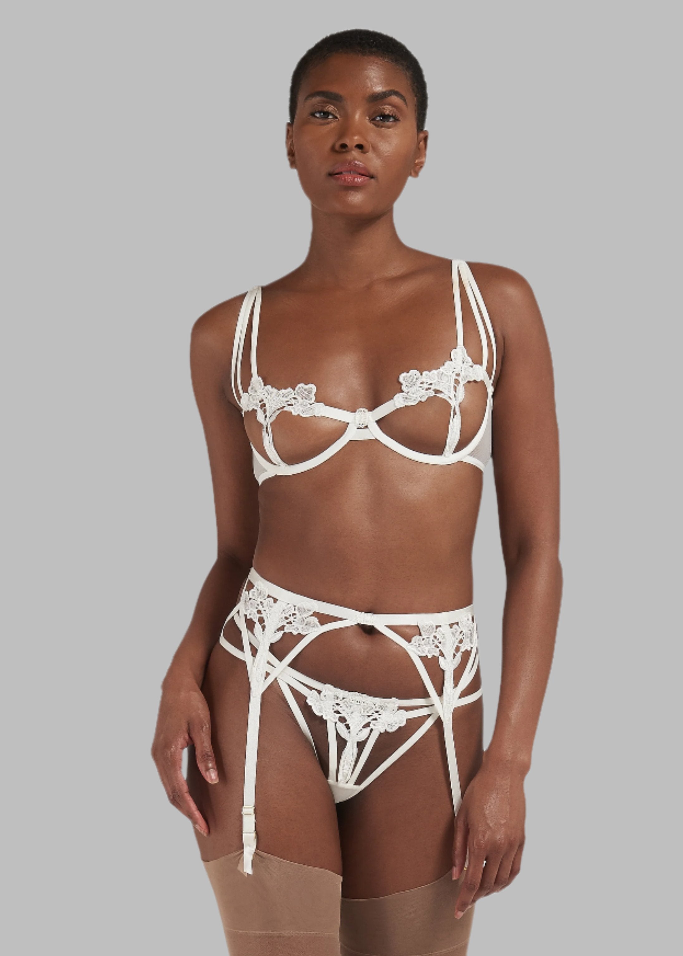 The exquisite Bluebella ouvert cup bra is a perfect piece of bridal lingerie for your honeymoon and beyond. The elegant embroidered floral motifs at the cups are complimented with a diamanté trim at center and a trio of delicate over-shoulder straps.