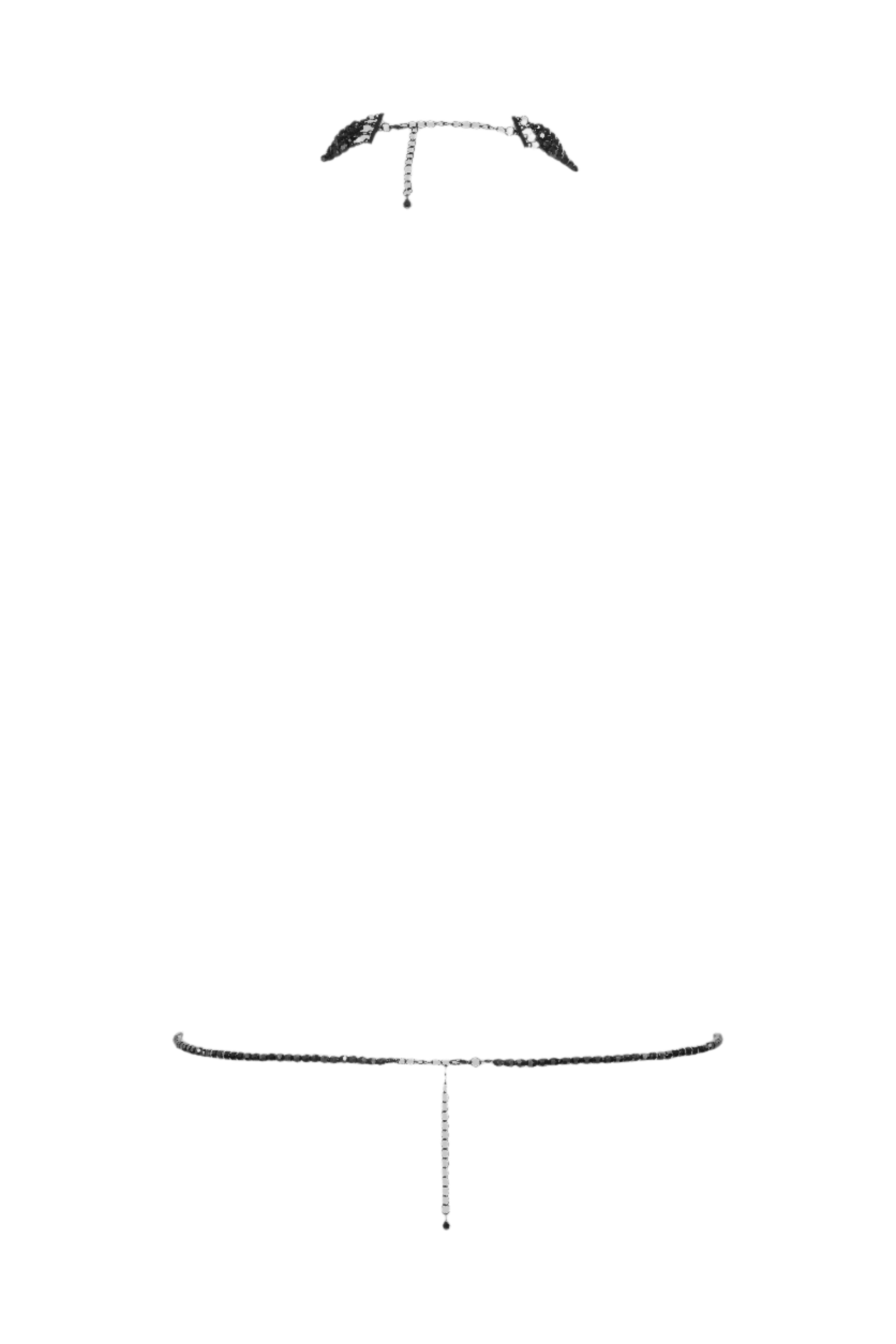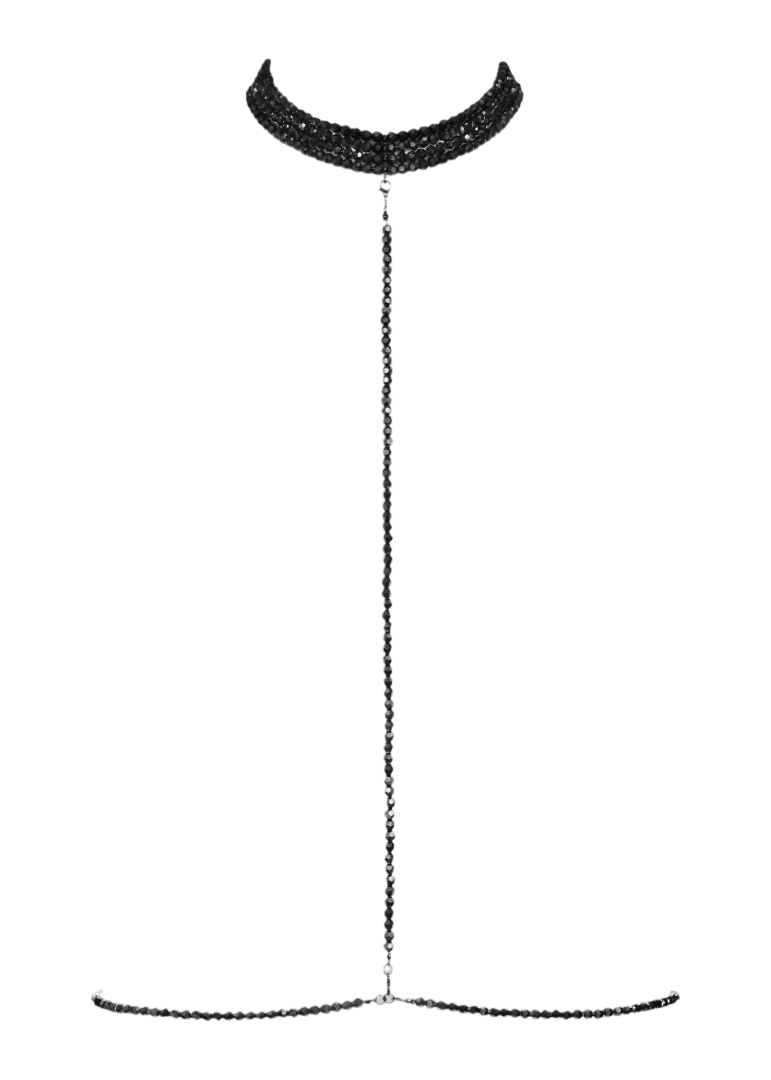 The "À ton cou" harness, crafted from jet black faceted glass beads, exudes opulence and luxury with its reflective brilliance that dances as you move. Its adjustable chains allow for a perfect fit, with a detachable collar and waist for versatility. Whether worn over lingerie or as a statement piece on its own, this harness adds an air of sophistication and allure to any outfit.