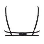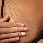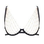 Indulge in splendor with the Frida Open Bra in a shimmering gold and black color scheme. This lavish garment boasts an exposed style and adorned with cascading beaded chains.