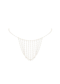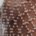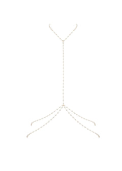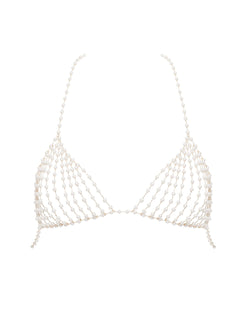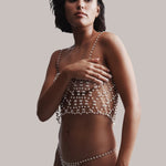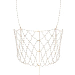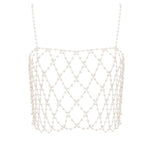A true embodiment of modern luxury, the Pearl Crop Cami is crafted from intricate gold-tone lattice chains, beautifully adorned with pearlescent beads. Perfect for layering over clothing to add a touch of glamour to any outfit, day or night, or wear it solo as a seductive lingerie piece that exudes sensuality and sophistication.