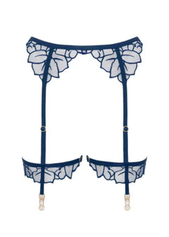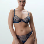 Embrace a blend of delicate artistry and confident support. This navy bra features intricate laurel leaf embroidery on sheer, underwired cups with scalloped edges. A timeless essential designed to flatter your silhouette. Complete the set with the matching pieces.