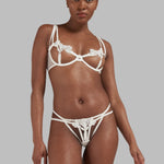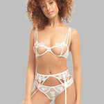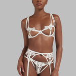 The exquisite Bluebella ouvert cup bra is a perfect piece of bridal lingerie for your honeymoon and beyond. The elegant embroidered floral motifs at the cups are complimented with a diamanté trim at center and a trio of delicate over-shoulder straps.
