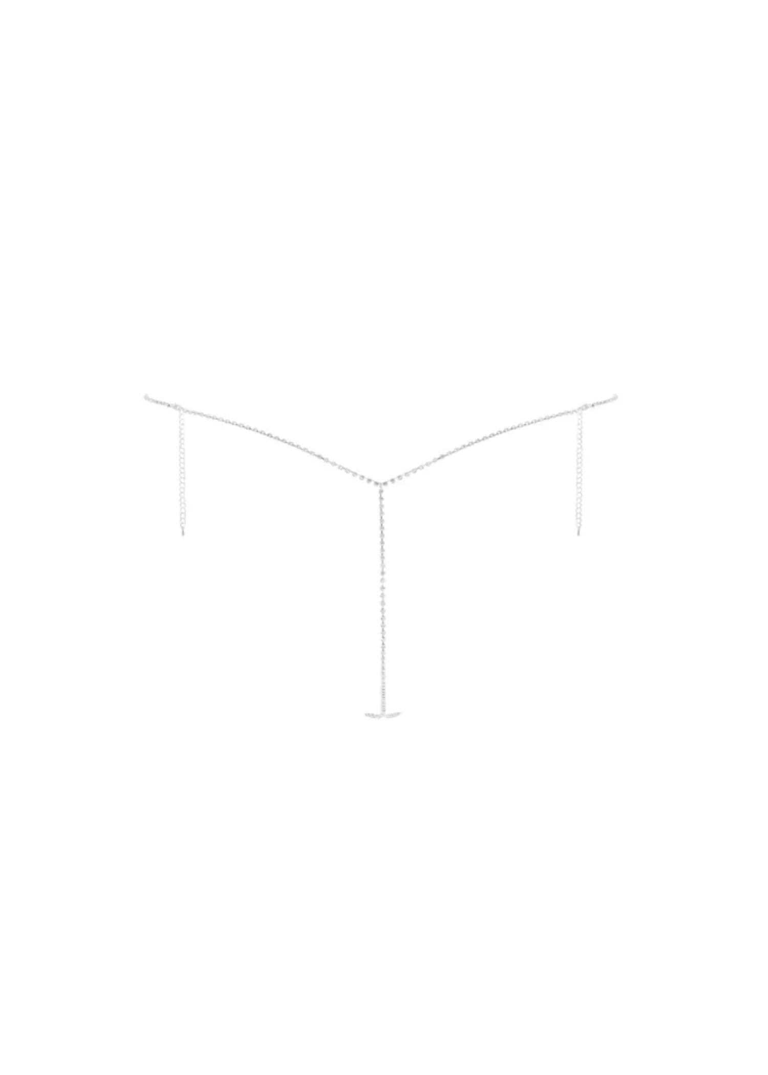 Designed with a fully open crotchless construction, the front is adorned with draped diamanté chains that move with the body, creating a striking play of light and texture. With diamanté side straps and its provocative open design, this piece is made for bold party styling or elevated intimate moments.