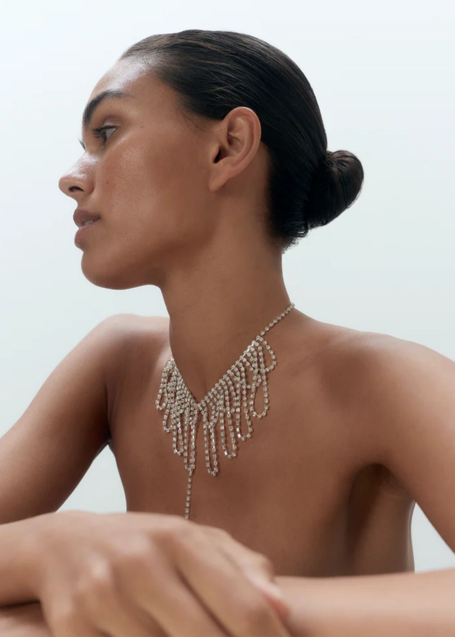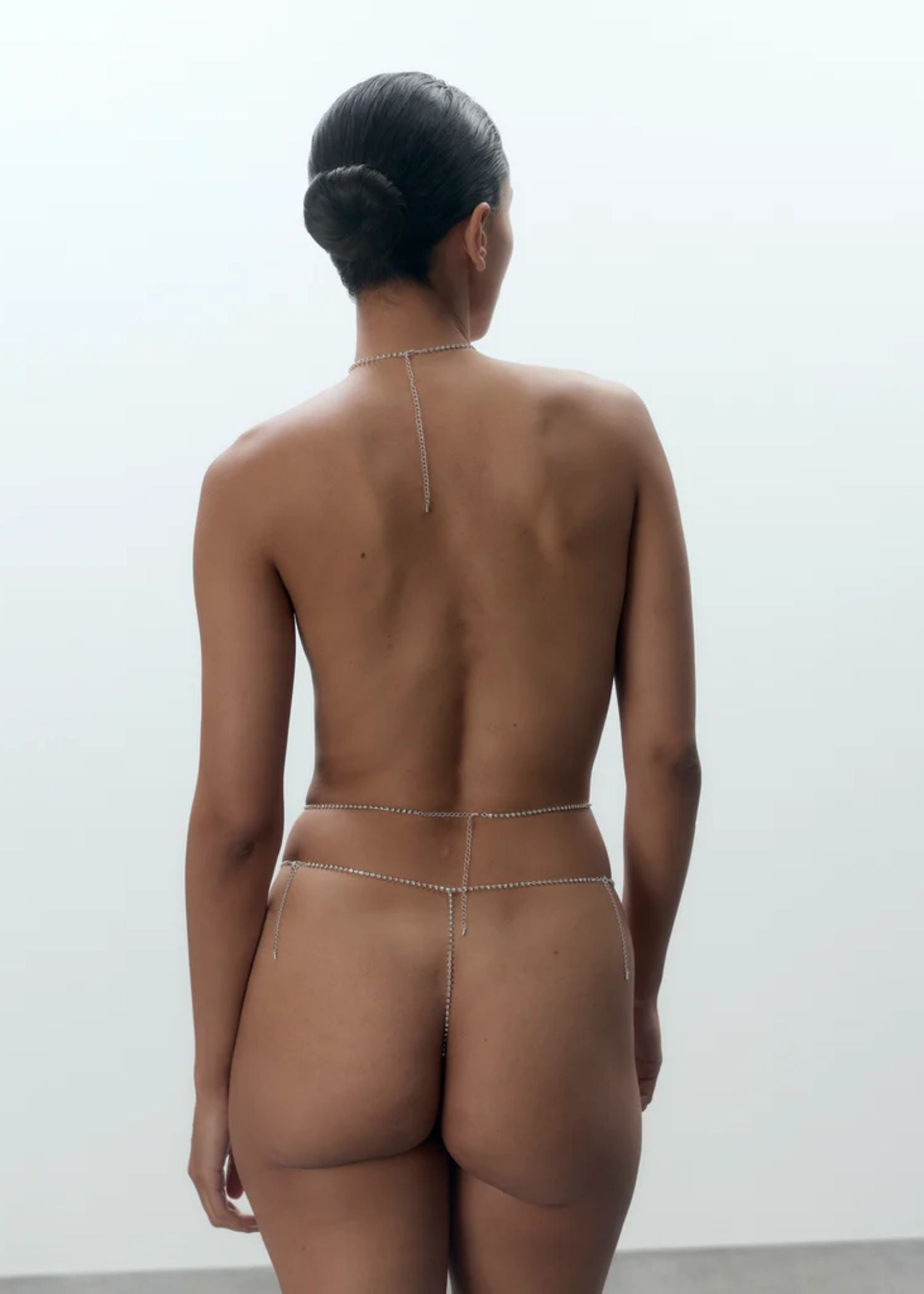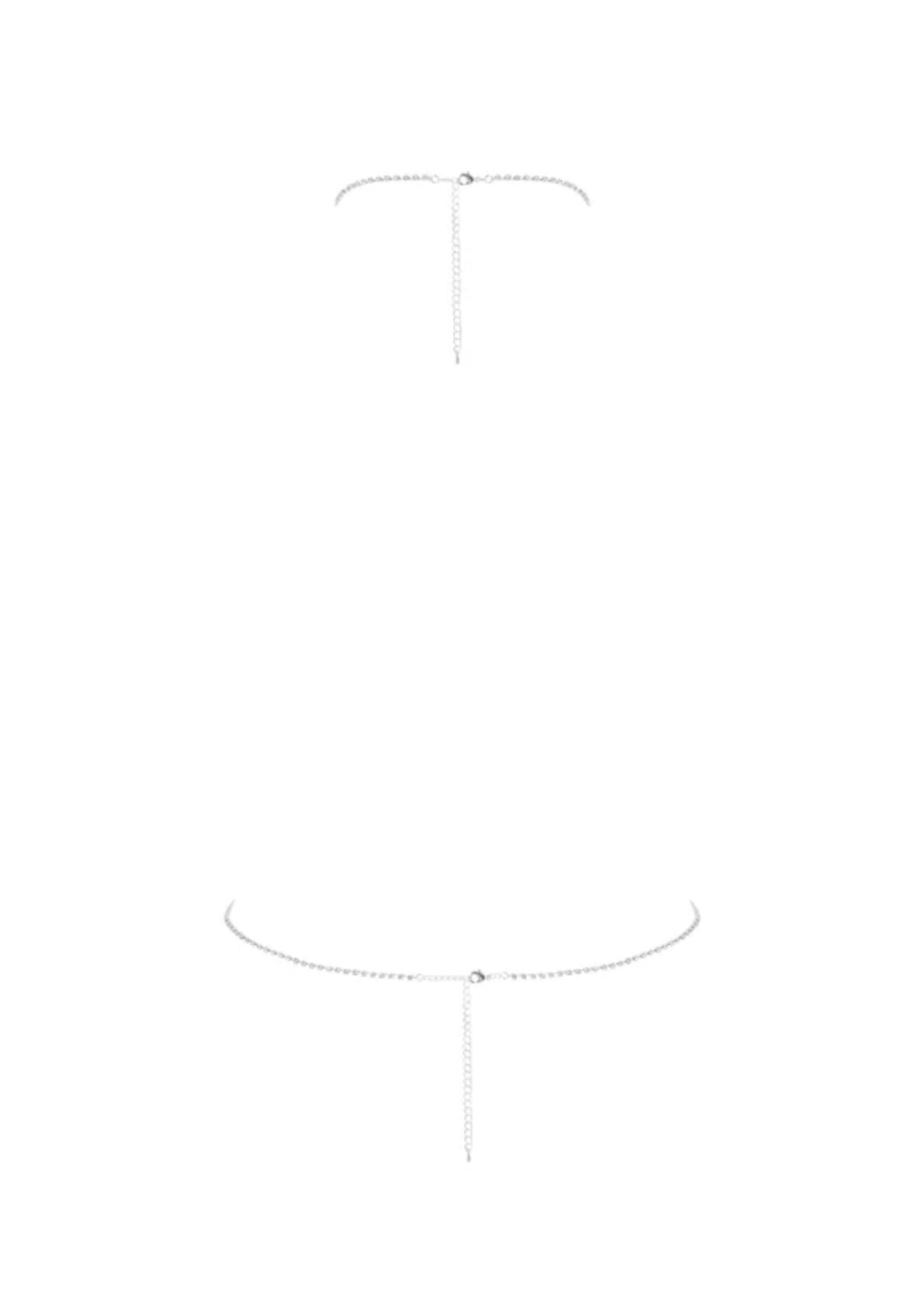 Draped diamanté chains encircle the neck and cascade down the body, adding a sensual edge to both partywear and lingerie looks. Finished with a rear lobster clasp for easy wear, this harness is the perfect final touch to the full Estelle set — or a bold standalone styling piece.